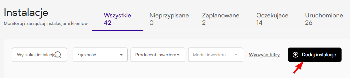 Żeby dodać instalację musisz wejść w menu w opcję “Instalacje”, a następne po prawej stronie ekranu wybrać przycisk “Dodaj instalację”.