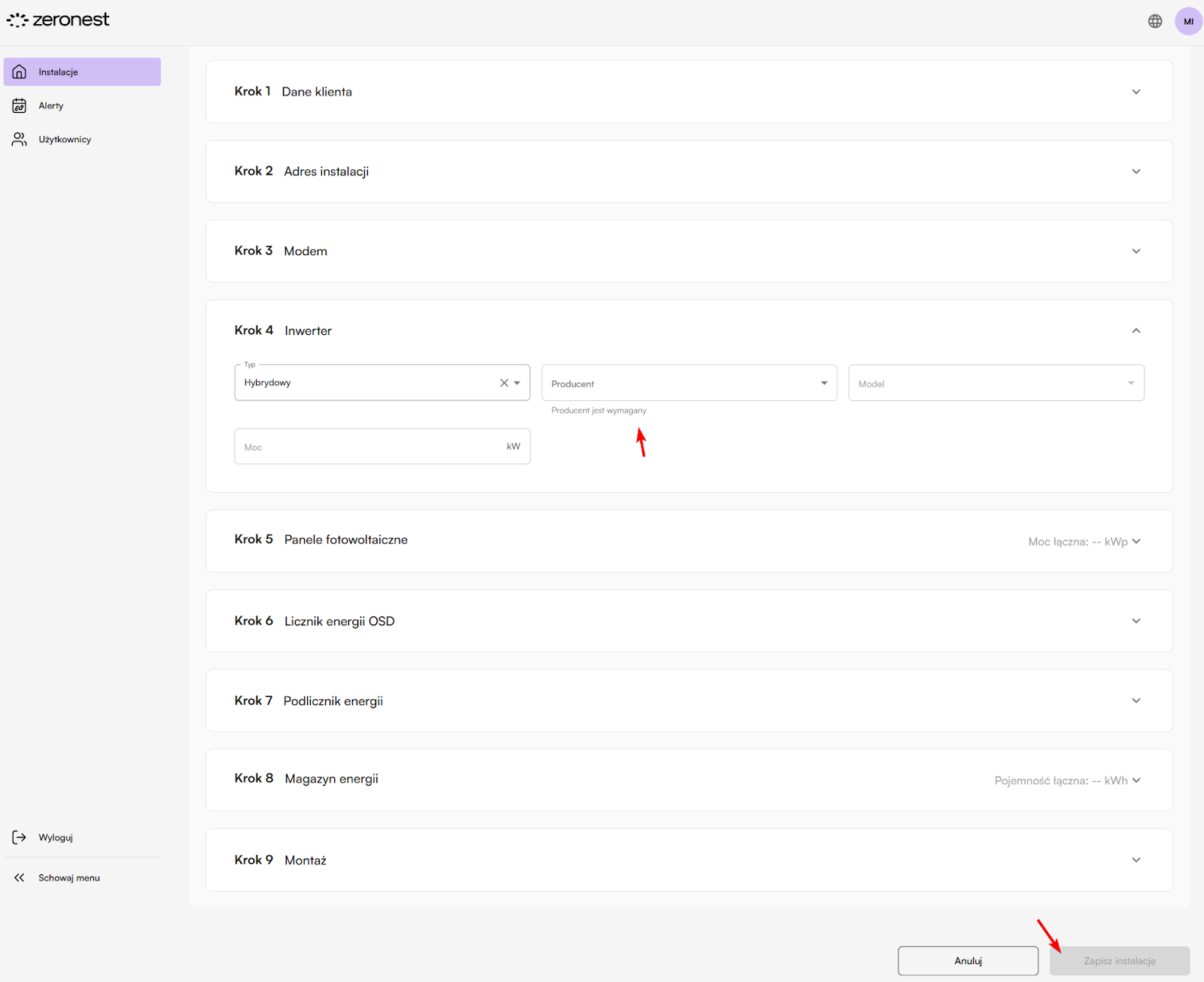Jedynym wyjątkiem, gdy stworzenie instalacji nie będzie możliwe jest przypadek, gdzie została wybrana niepełna konfiguracja urządzenia. W tym wypadku jest wymagane uzupełnienie wszystkich pól z rozwijanymi listami. Na przykład dla inwertera po wybraniu typu urządzenia jest wymagane, aby użytkownik wybrał także jego producenta oraz model urządzenia: