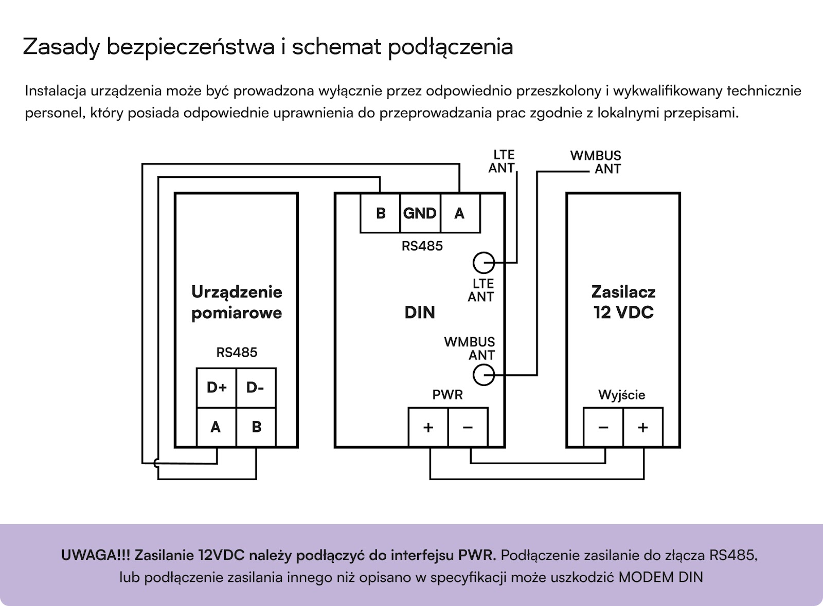 Przed podaniem napięcia sprawdź poprawność podłączeń oraz poprawność polaryzacji napięcia zasilającego Modemu DIN LTE. - Konfiguracja urządzenia odczytowego (np. inwertera)